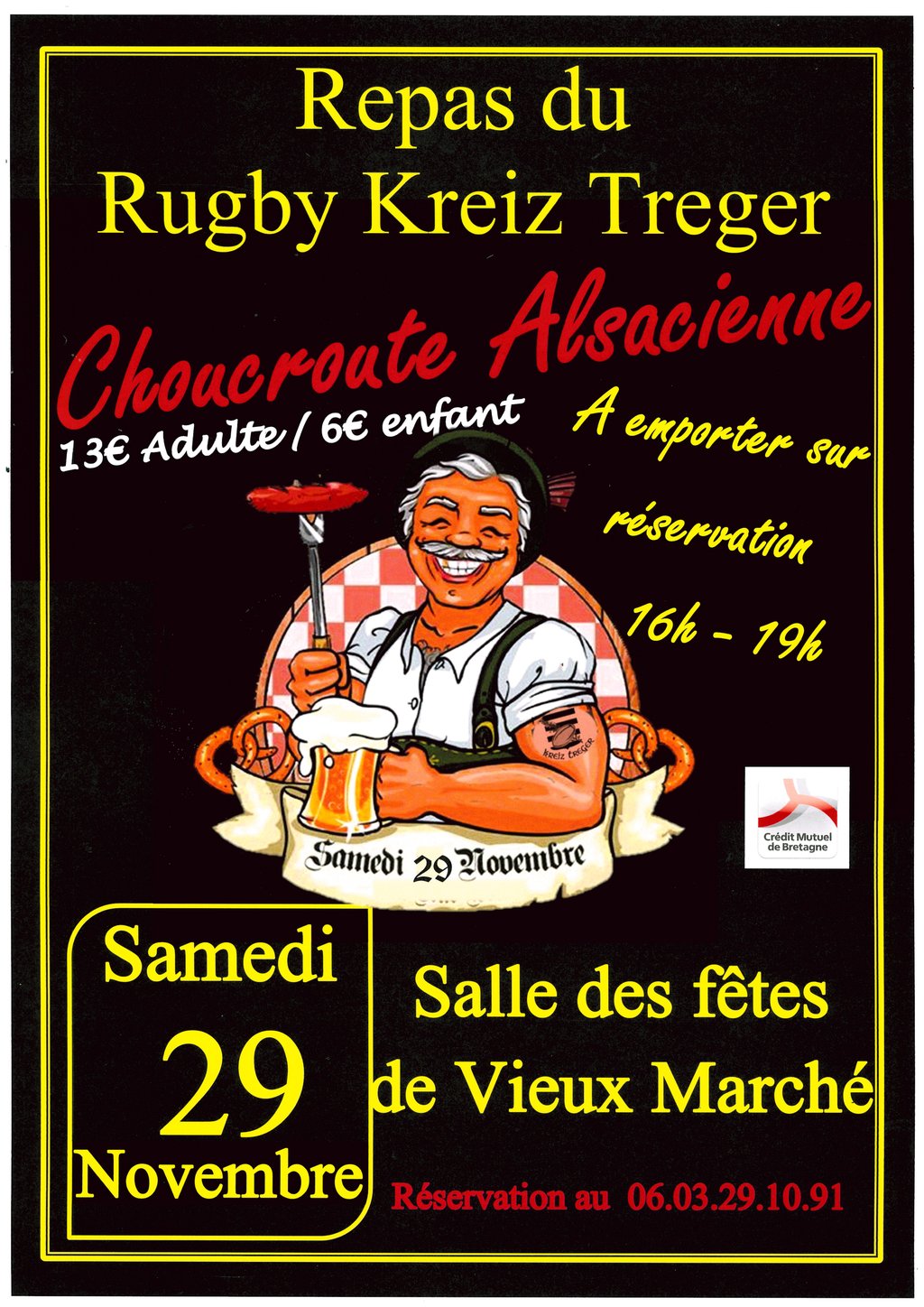 Repas à emporter "choucroute alsacienne" le samedi 29 novembre à la salle Roger Arzur. Repas à emporter sur réservation au 06.03.29.10.91. Adultes 13 € et enfants 6 €.