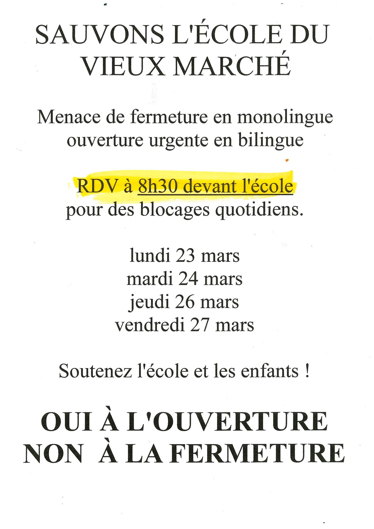 Menace de fermeture en monolingue / Ouverture urgente en bilingue. Rendez-vous à 8h30 devant l'école pour des blocages quotidiens les lundi 23, mardi 24, jeudi 26 et vendredi 27 mars.