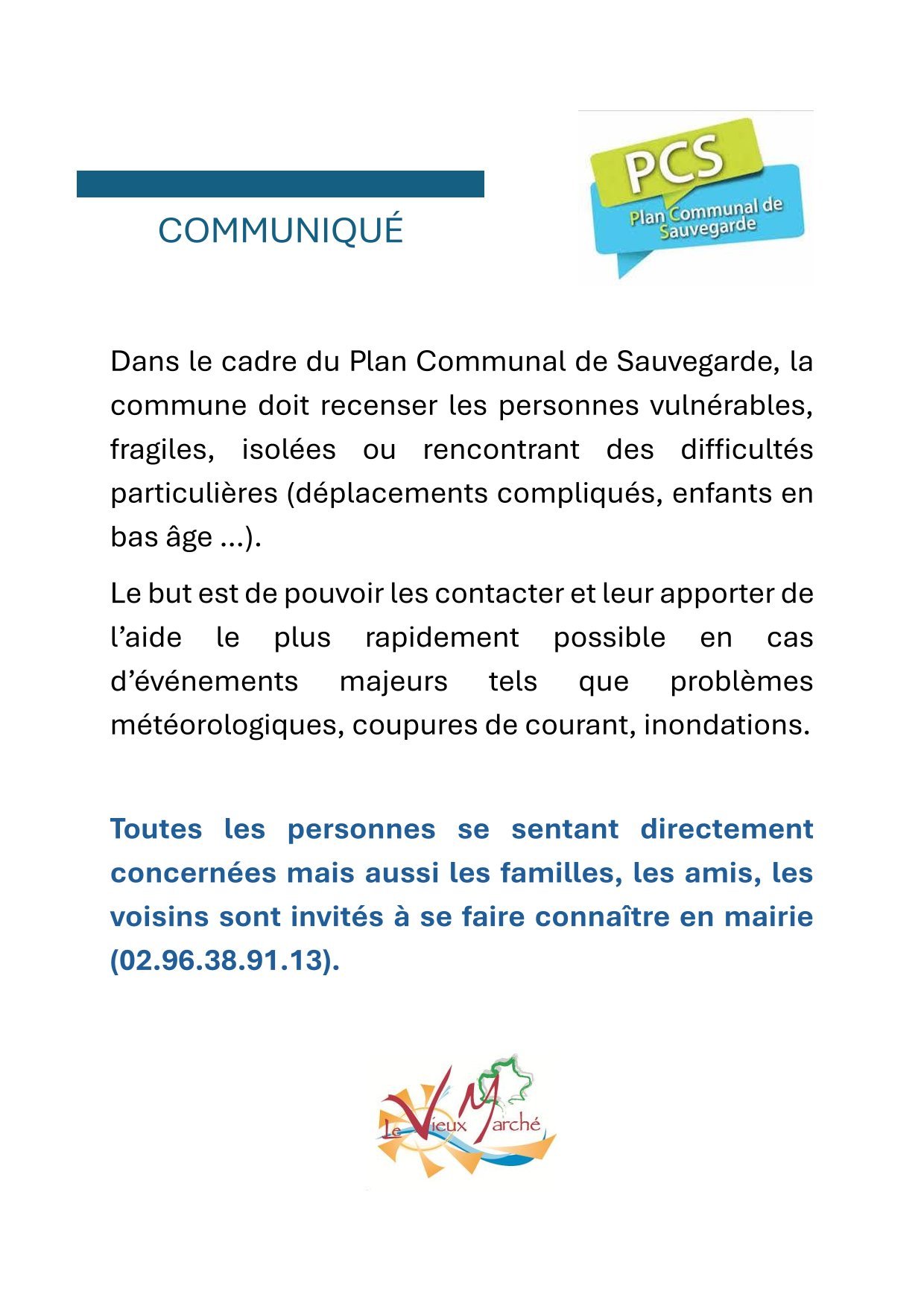 Afin de pouvoir agir rapidement en cas de problèmes météorologiques majeurs, de coupures de courant, la commune souhaite recenser les personnes vulnérables du territoire. Merci de contacter la mairie pour vous y inscrire ou pour toute demande d'information complémentaire. 0296389113