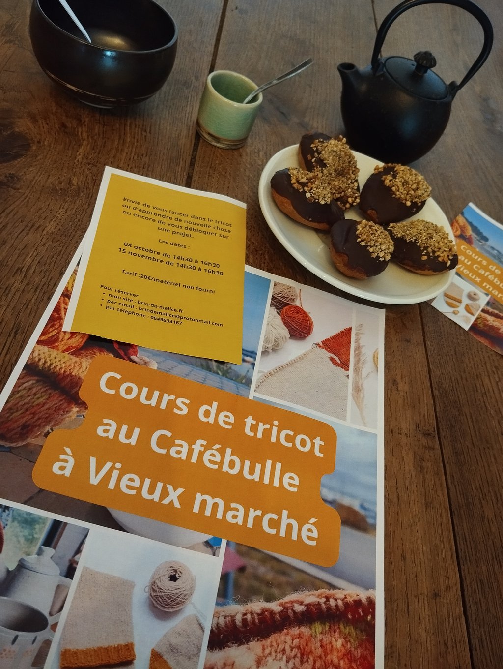 Atelier de tricot animé par Brin de Malice (vous la connaissez, elle vient une fois par mois au marché avec ses laines colorées avec des teintures végétales)