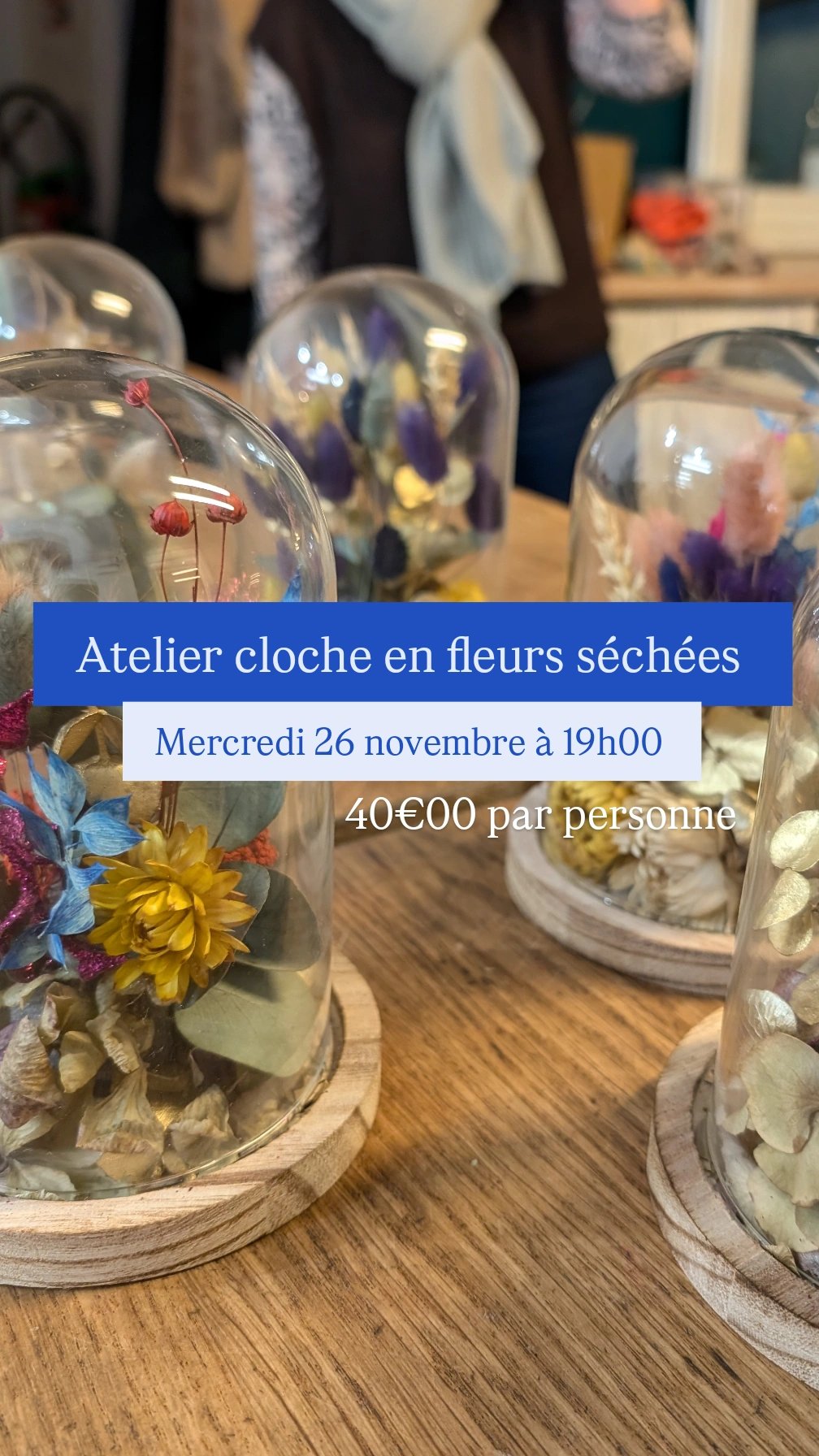 Venez créer votre cloche en fleurs séchées, vous choisirez vos fleurs, votre couleur et votre style