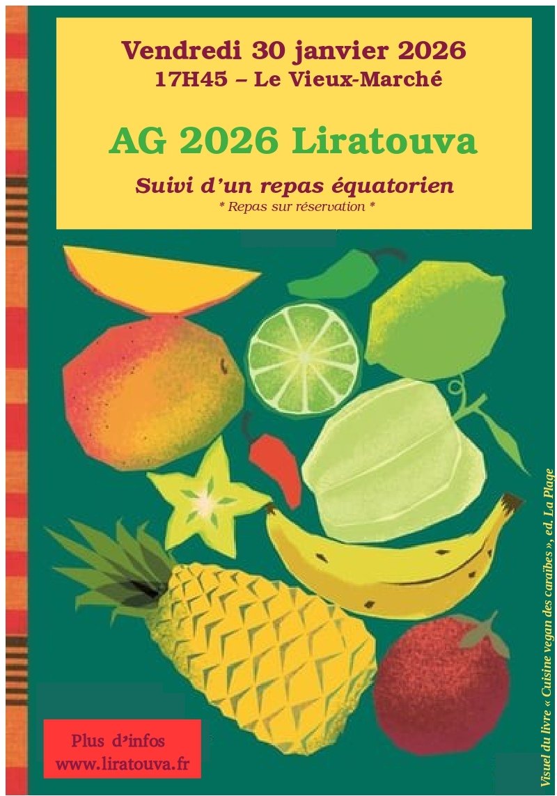 Assemblée générale de LIRATOUVA le vendredi 30 janvier 2026 à 17 h 45, suivi d'un repas équatorien (sur inscription).